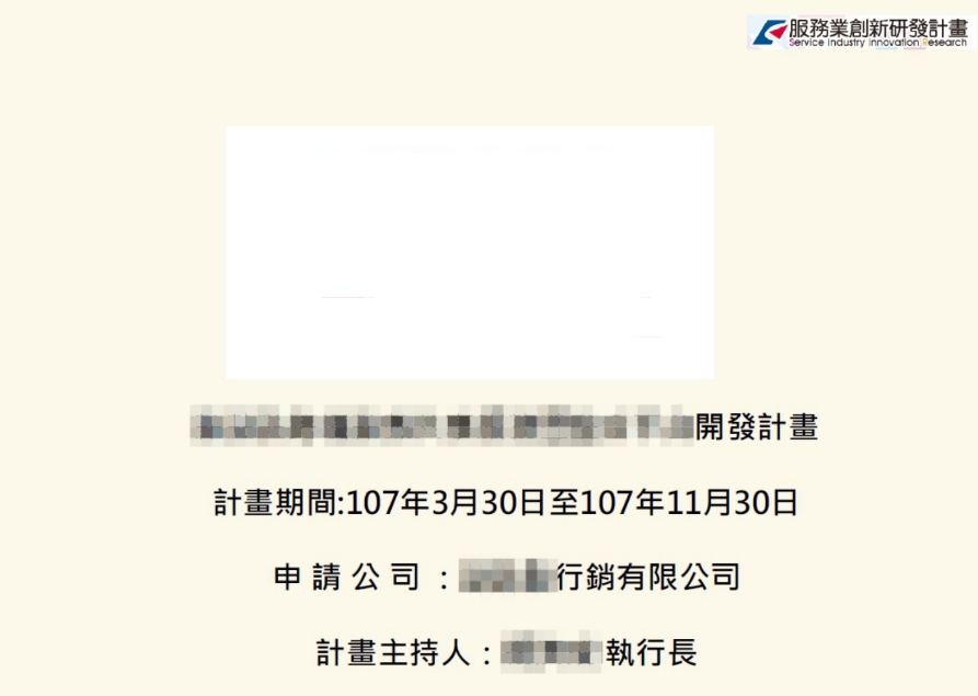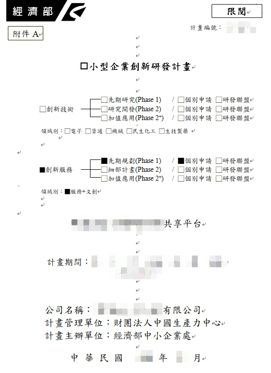 經營管理 因保密條款及合約之因素無法全數揭露煩請見諒 服務業創新研發計畫(SIIR)企劃書撰寫 XXX行銷有限公司 小型企業創新研發企畫(SBIR)企劃書撰寫 XXX有限公司 分享此文: 按一下即可分享至 X(在新視窗中開啟) X 按一下以分享至 Facebook(在新視窗中開啟) Facebook 喜歡 正在載入...